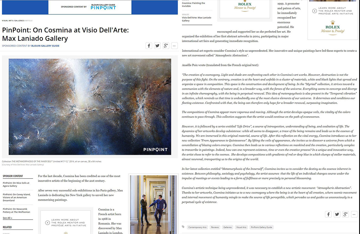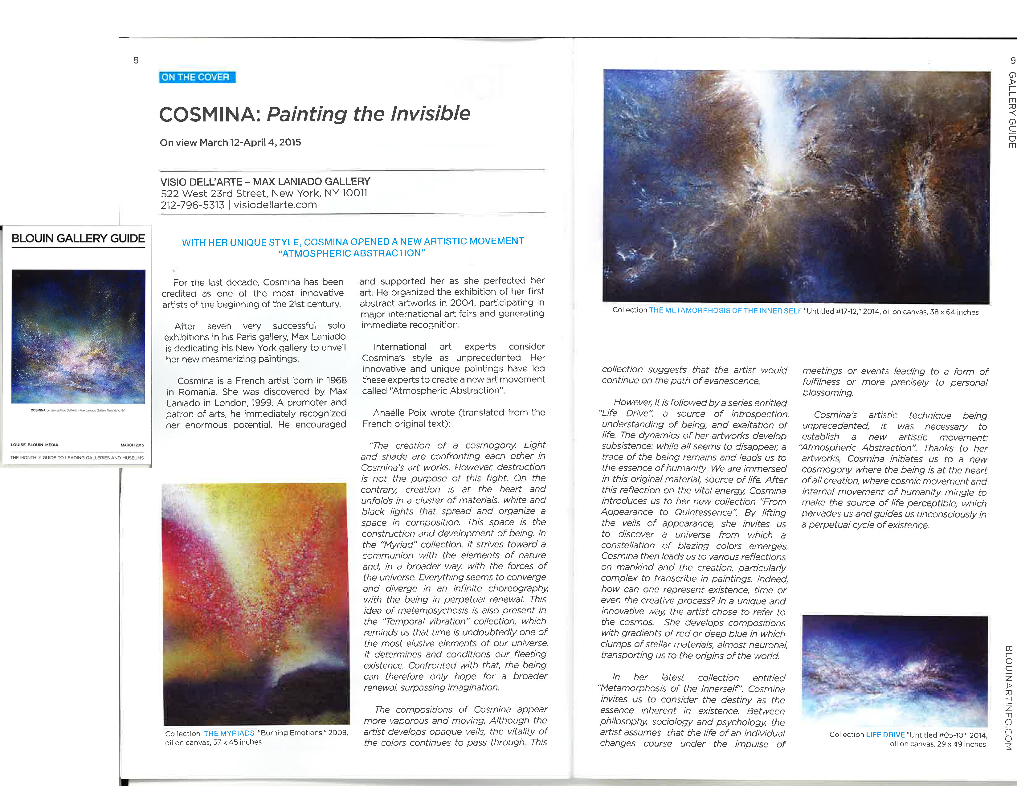 At the occasion of Cosmina's solo exhibition in New York (November 2016), John Sebastian, CEO and publisher of the New York Optimist, met with the artist and published a comprehensive article and interview with Cosmina.
